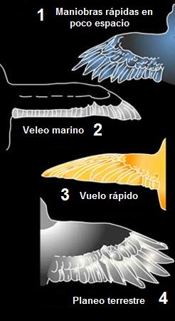 Formas de alas 1) La mayoría de las aves que viven en ambientes con vegetación cerrada, pastizales y en la espesura del bosque presentan alas elípticas. Este tipo de ala permite maniobrar en espacios cortos con gran rapidez. 2) Se llama ala larga planeadora o ala de veleo, que es la característica de los albatros, que tienen las alas más largas de todas las aves, alcanzando una envergadura de hasta tres metros. 3) Es una clase de ala muy aerodinámica que permite tomar gran velocidad en espacios amplios y maniobrar. A esta ala se le conoce como ala rápida. 4) Las aves que planean en los espacios abiertos tienen alas de silueta redondeada muy anchas en su base y con los extremos de las plumas separados, denominándosele ala ancha planeadora. En muchas especies se encuentran formas intermedias.